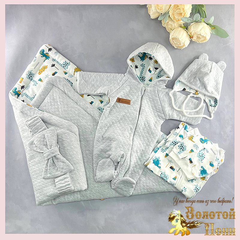 Плед-одеяло-конверт, комбинезон на хлопке с капюшоном, комбинезон нательный, шапочка, шапочка с завязками, бант-резинка