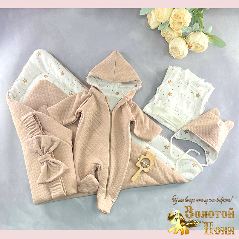 Плед-одеяло-конверт, комбинезон на хлопке с капюшоном, комбинезон нательный, шапочка, шапочка с завязками, бант-резинка