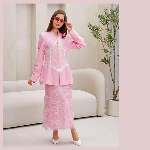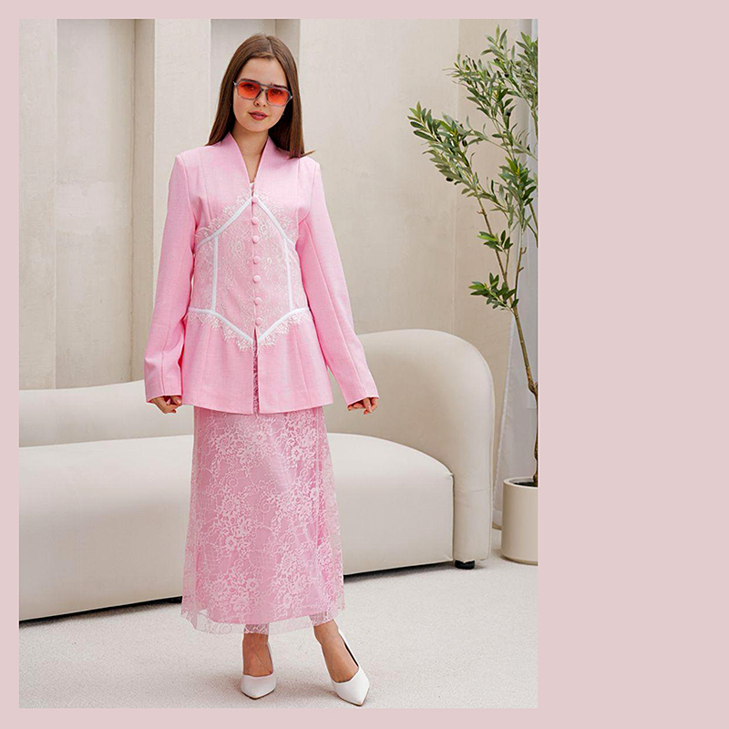 Пиджак на подкладе — держит форму, красиво садится по фигуре, подчёркивает силуэт./Юбка с гипюром — добавляет женственности и лёгкой изысканности.
